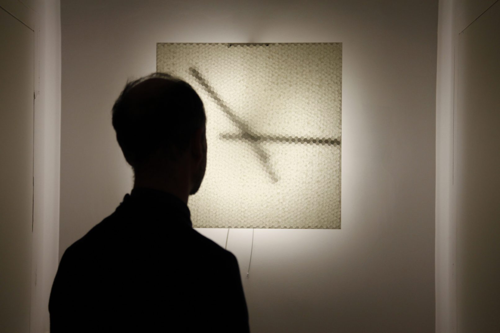 Horloge Pixel : Applique en nid d’abeille en fibres de verre et aluminium, mouvement d’horloge, tube fluorescent, structure métal.