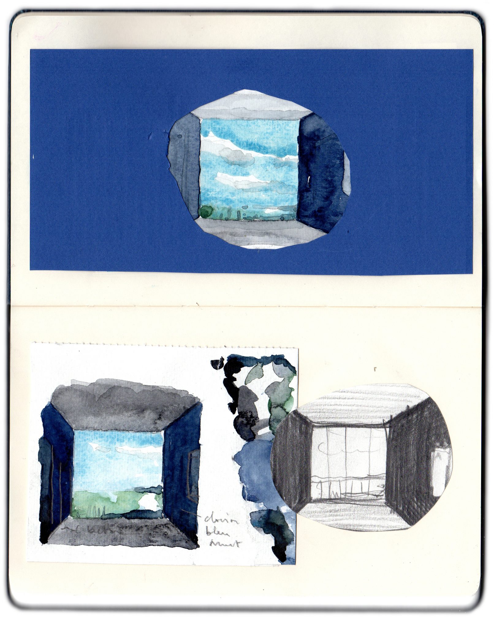This blue room emphasizes the light and scenery. The room planning only consists of two plywood partitions framing the sea view from the bay window to the entrance. It enhances the perspective and set the scene for this Mediterranean landscape. When entering the room, the visitor is guided to the balcony, invited to contemplation.