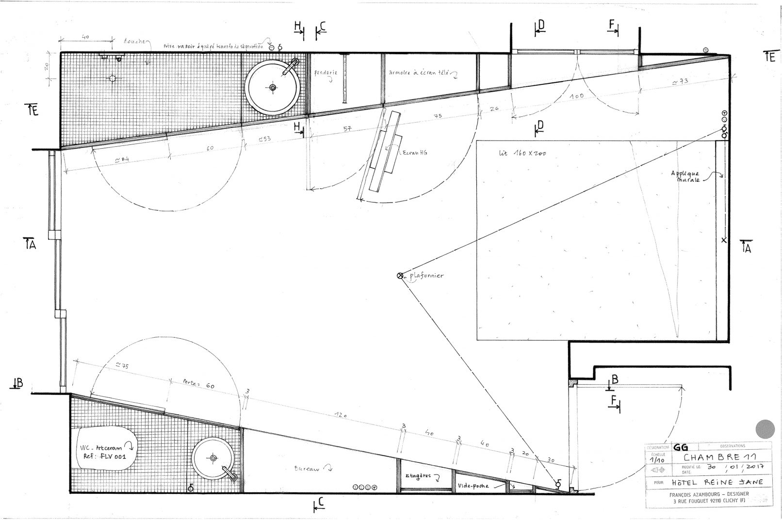 Cette chambre bleue donne une importance toute particulière à la vue et à la lumière. De la hauteur exacte de la baie vitrée, deux cloisons en contre-plaqué constituent l’essentiel de l’aménagement. Elles forment une perspective cadrant la vue mer, mettant en scène le paysage. Dès qu’il ouvre la porte, elles guident le visiteur vers le balcon et l’invite à la contemplation.