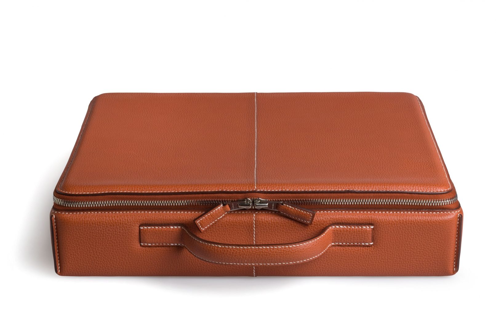 Briefcase made of a patented composite material, consisting of a flexible sandwich of leather and foam. The assembly is made by folding and sewing. Herlight is soft and self-structured, and is exceptionally lightweight.