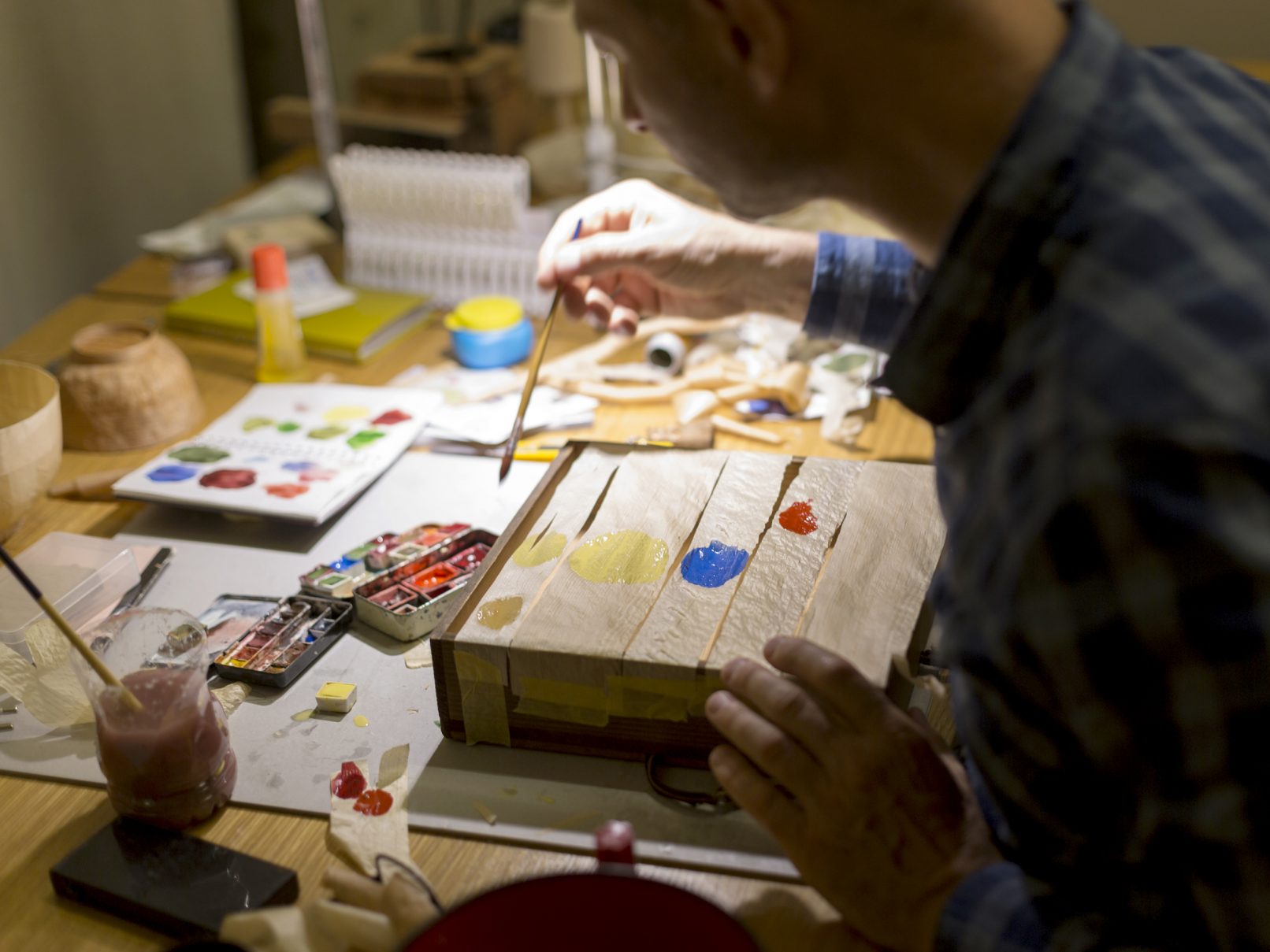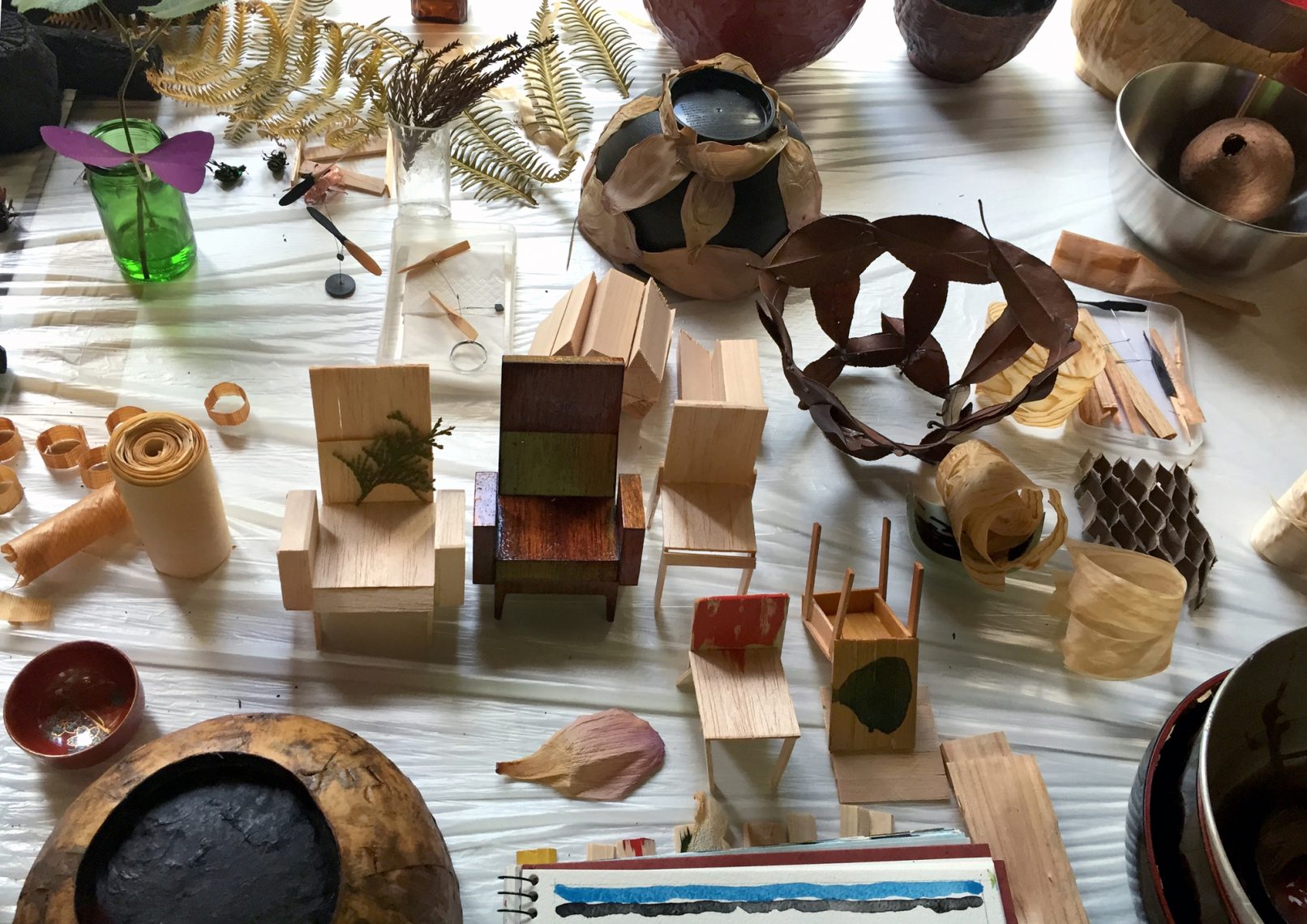 La résidence à la Villa Kujoyama en 2015 a eu pour objet d’explorer les nouveaux langages du bois en associant artisanat et techniques industrielles. Le point de départ a été les rebus de fabrication de l’atelier de charpentiers Yamamoto Kogyo à Kyoto et le travail de la laque à Wajima. En utilisant principalement des copeaux de bois assemblés par tissage et par collage, est née une série d’objets dont le point commun est une recherche sur la légèreté du matériau et la simplicité des protocoles de fabrication. Parallèlement, il a été entamé une recherche sur des modes d’assemblage sans émission de copeaux ou de poussière, à partir de bois fendu.